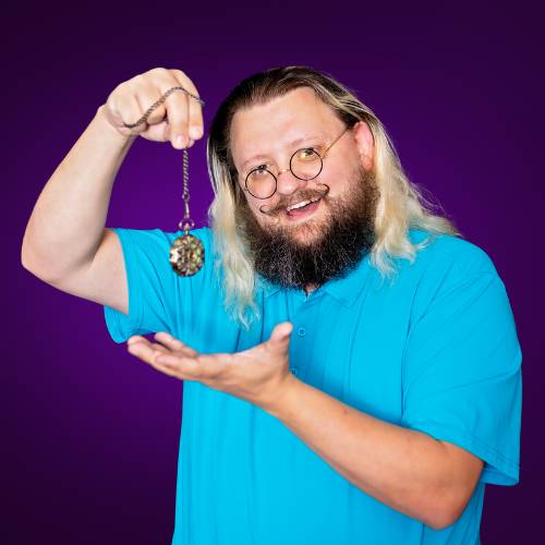Roger, a.k.a. The Timeless Hypnotist, captivates audiences at high schools, grad parties, and colleges with his dynamic performances. Whether he’s turning the class clown into a ballet dancer or having your best friend speak fluent Martian, Roger’s shows are a rollercoaster of humor and hypnotic wonder.